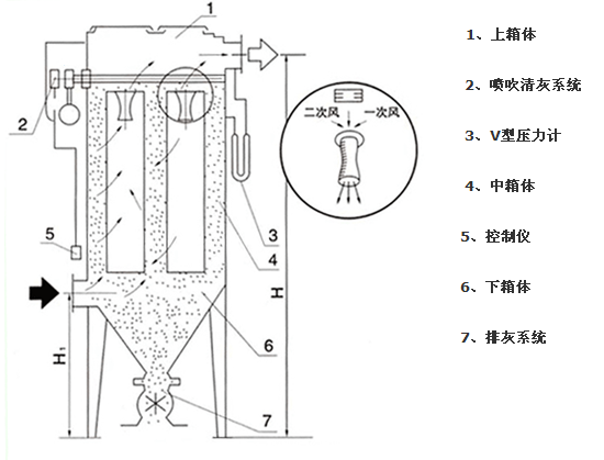 DMC單機(jī)除塵器由上、中、下箱體,排灰系統(tǒng)及噴吹系統(tǒng)五部分組成。上箱體包括可掀的蓋板和出風(fēng)口;中箱體內(nèi)有多孔板、除塵器骨架、除塵器濾袋及文丘里管;下箱體由灰斗、進(jìn)風(fēng)口及檢查門組成;噴吹系統(tǒng)包括控制閥、脈沖電磁閥、噴吹管和氣包。