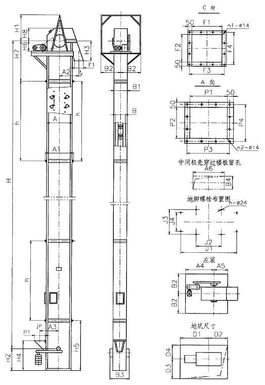 NE系列板鏈斗式提升機(jī)外形示意圖:
